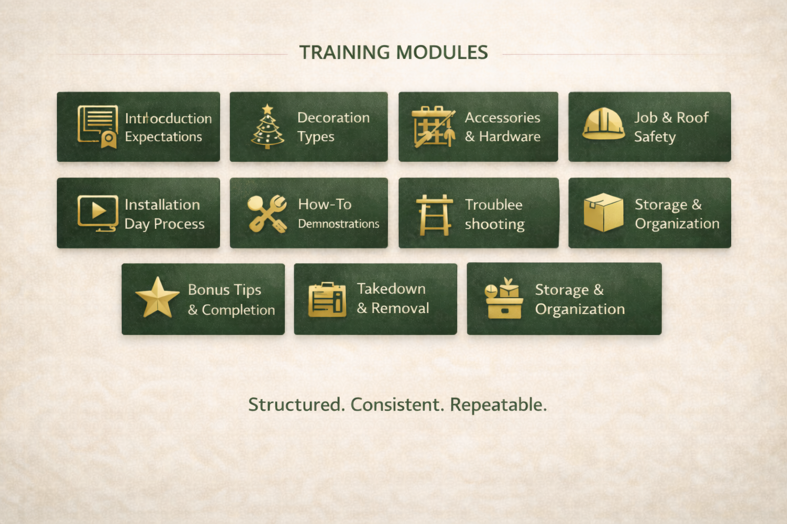This becomes your official installer onboarding system — consistent installs, fewer mistakes, faster ramp-up.